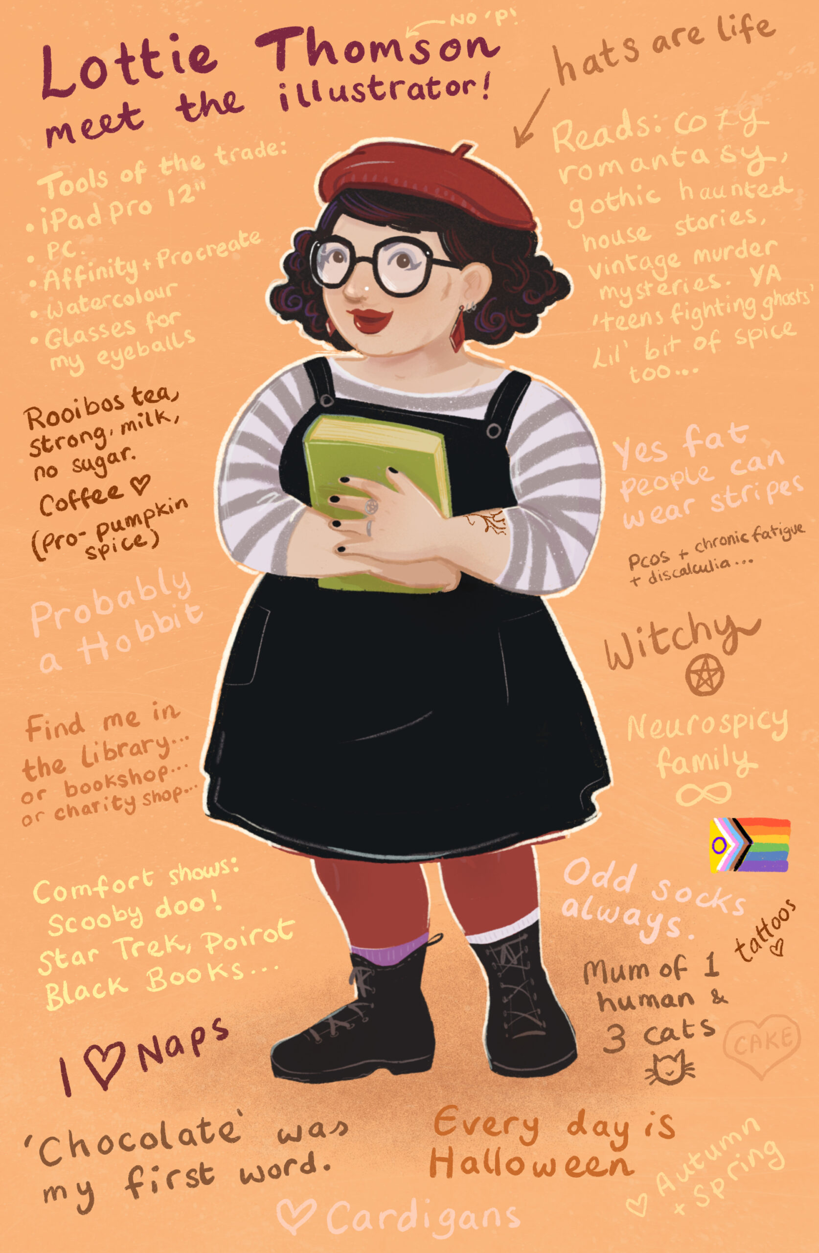 Lottie Thomson (Charlotte Thomson-Morley she/her) is an illustrator, fine artist and library worker based in Nottinghamshire in the heart of England. She specialises in character art that is consciously inclusive of different body sizes, queer and disability friendly, full of personality, warmth and humour.